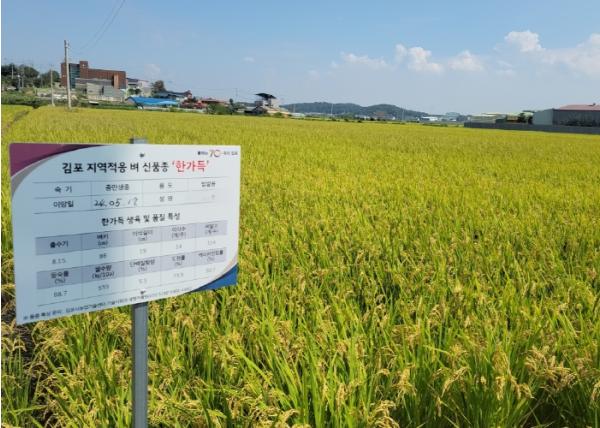 ‘한가득’ 벼 품종은 50년이상 장기 재배로 품종 특성이 퇴화되고 있는 외래품종인 김포 대표 중만생품종 ‘추청벼’를 대체하여 김포지역에 적합한 국내육성 신품종을 개발·보급하기 위해, 김포시가 지난 2020년부터 농촌진흥청의 ‘수요자 참여형 벼 품종 육종사업’을 통하여 국립식량과학원과 공동으로 개발한 벼 신품종이로 올해 약40㏊ 면적에 재배됐다.